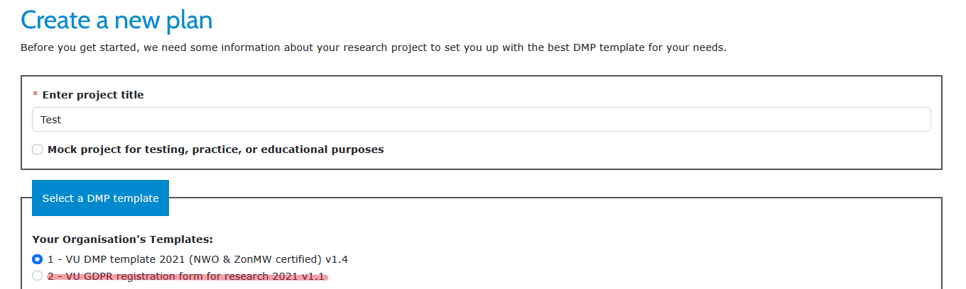 If you’re aiming to write a full DMP based on VU Amsterdam DMP template, please make sure you don’t select the GDPR registration form.